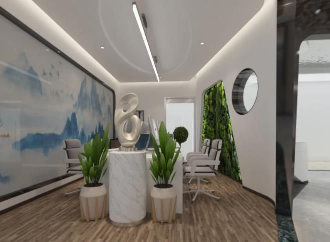 3、天花水波紋鏡面不銹鋼波光粼粼,倒影婆娑,中間點綴白色射燈,星光點點,仿佛仰望銀河,體驗區(qū)靠落地窗橢圓拱形網(wǎng)狀金屬鏤空材質(zhì),霧里看花,花更美,營造朦朧隱約東方詩意之境,呼應(yīng)品茶洽談區(qū)中式嵌入式茶桌,讓顧客感受尊貴體驗同時一覽江景,身心徹底放松達到物我兩忘之境。辦公樓產(chǎn)品展示區(qū)蜂窩背發(fā)光造型突出展品的高科技品質(zhì)感。辦公區(qū)裝飾設(shè)計:山水玻璃隔斷與綠植墻共同營造呼吸在山水綠意之間的意境,讓工作充滿詩意與生機,通透圓形玻璃與前廳區(qū)連接,運用借景設(shè)計手法,給空間帶來意趣。